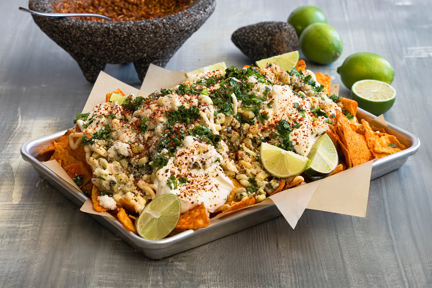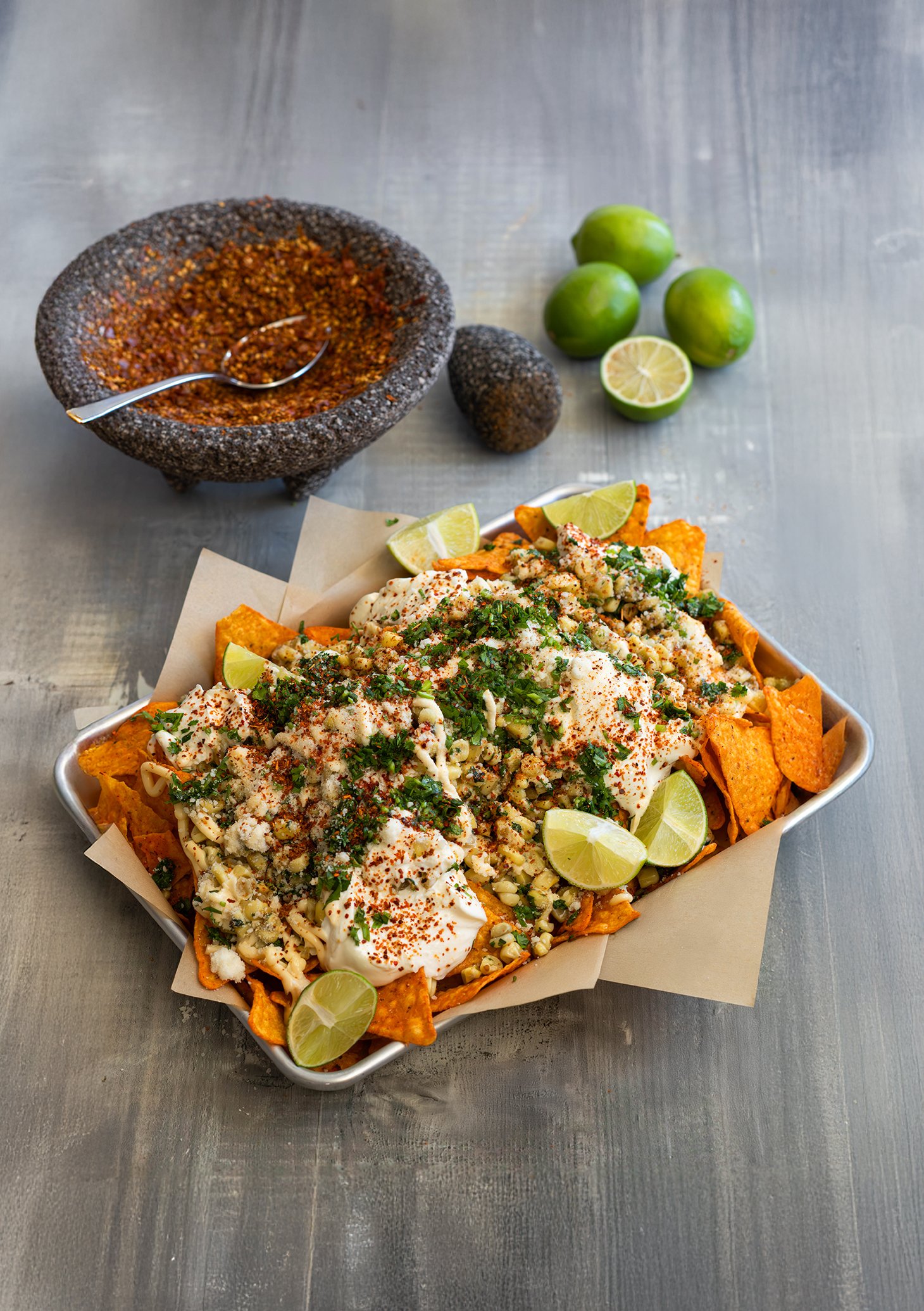 Add corn and cook for 5 minutes, stirring frequently. Add 1/3 cup cilantro, crushed pequin chiles and salt. Stir and continue cooking for 6 minutes. Do not burn. Remove from heat and set aside. - Evenly arrange Doritos on a baking sheet. Top with cooked corn, mayonnaise, dollops of sour cream, cotija, remaining cilantro, Tajin and lime juice. Serve and enjoy.
