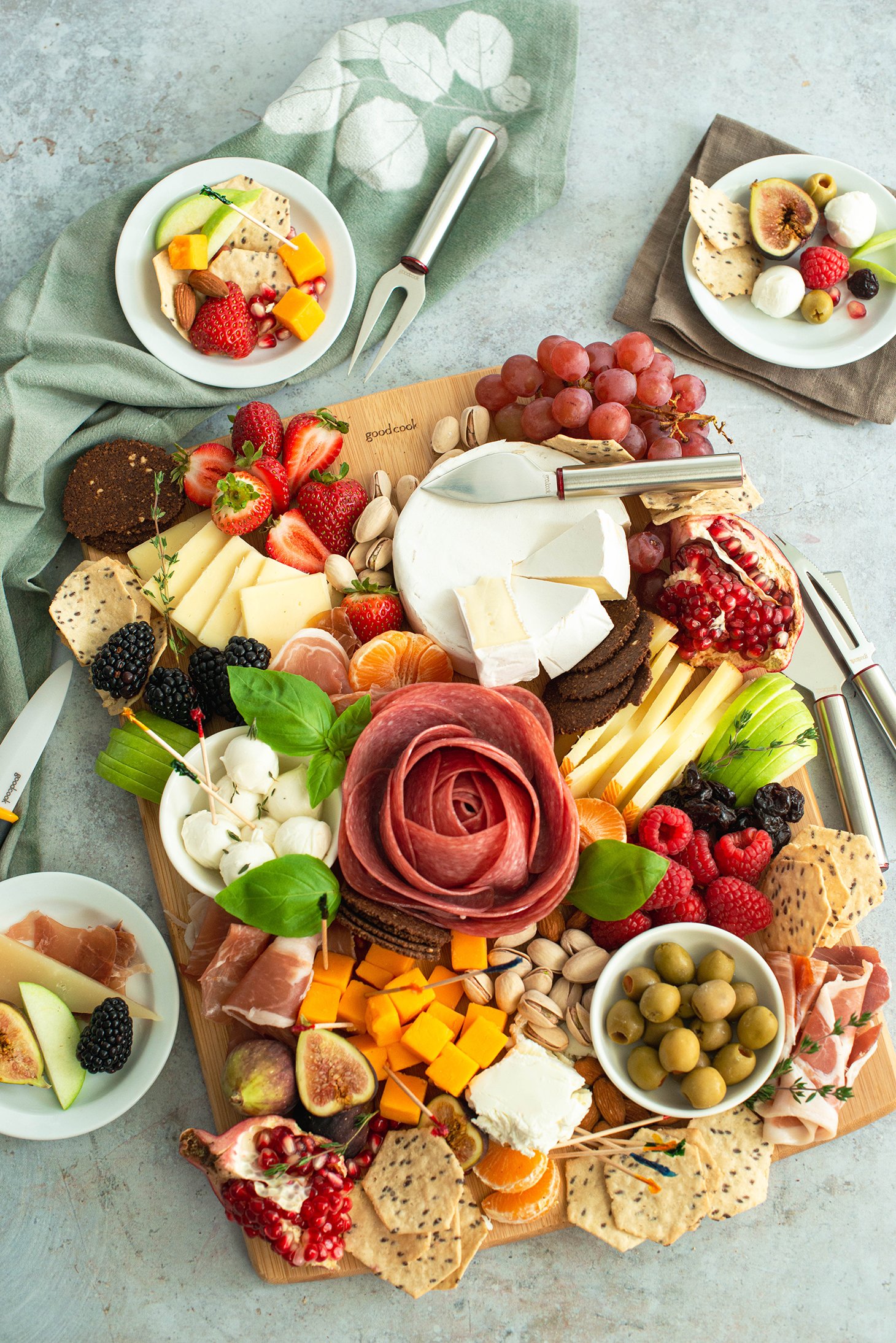 - Tip: A bamboo cutting board works perfectly. You can also use slate boards, rimmed baking sheets, or a mix of platters to spread things out and create movement.