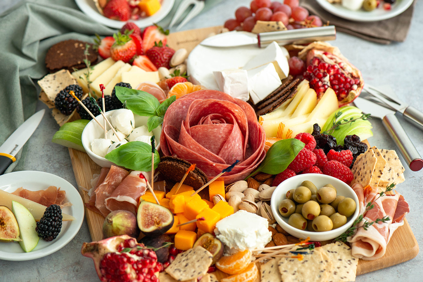 - Choose your board wisely. Depending on the number of guests, pick a surface large enough to hold all ingredients, plates, napkins, and maybe even a space for drinks as you snack.