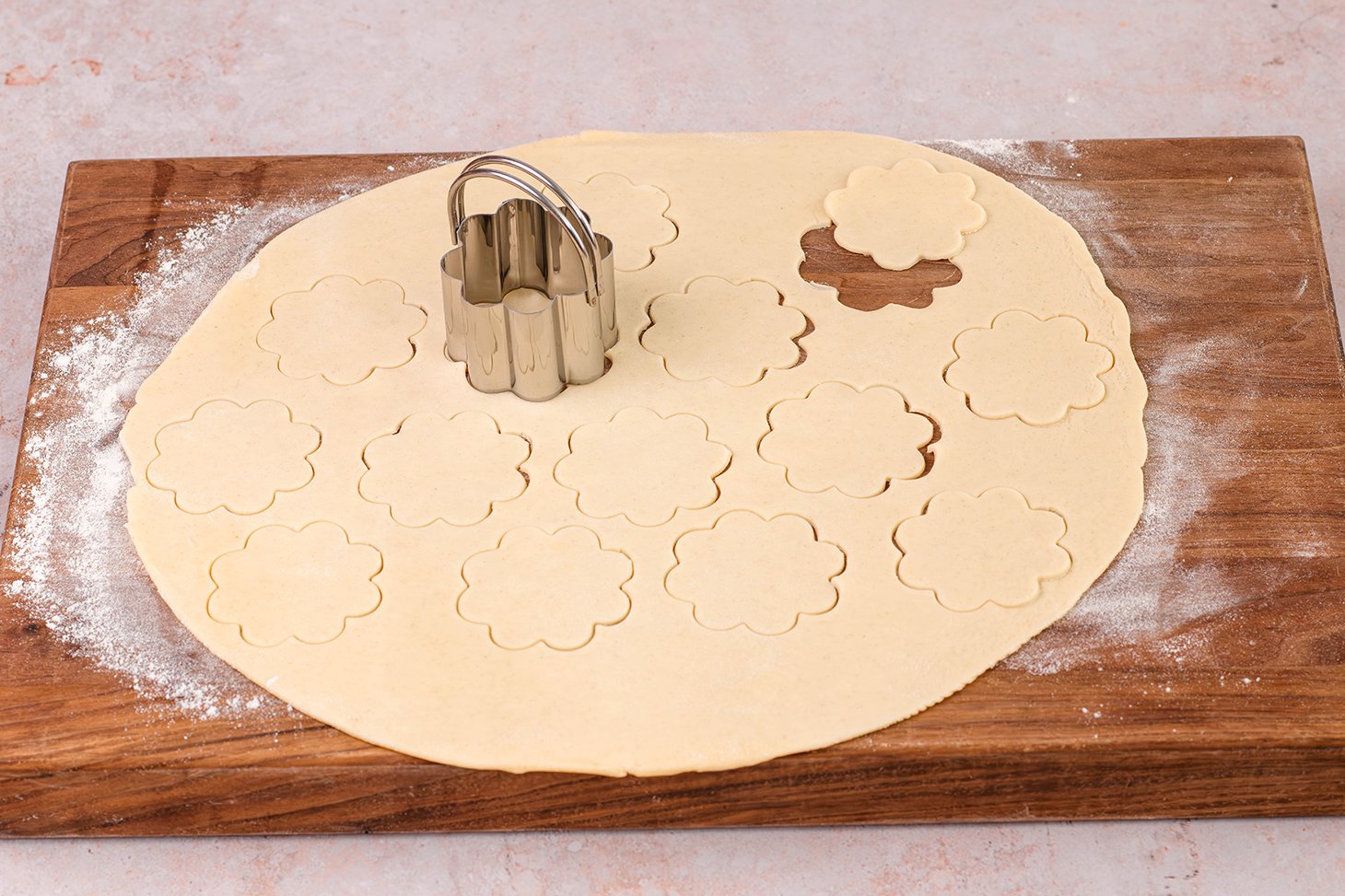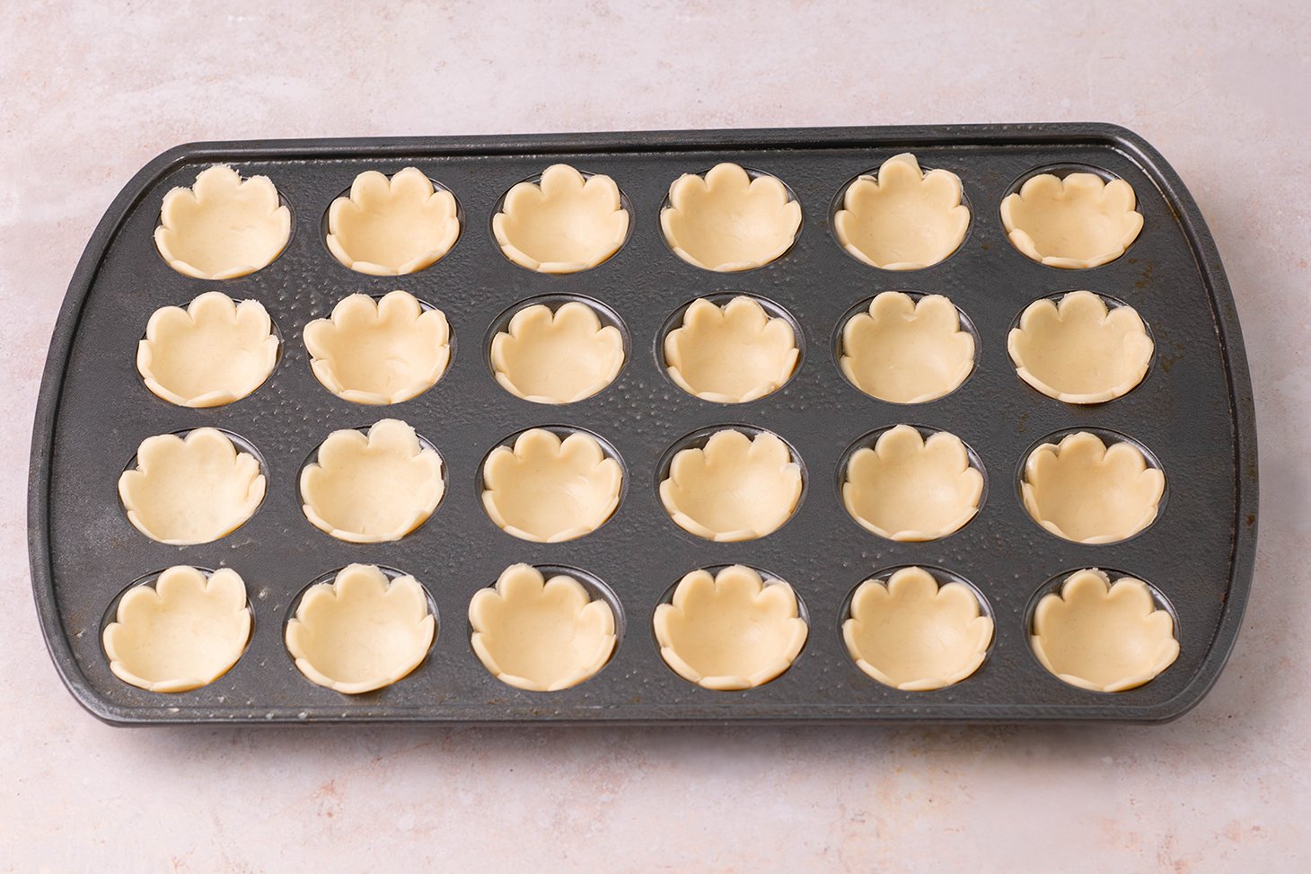 - Sprinkle flour on a work surface. Roll out the pie dough. Use a 2 ½-inch flower shaped cookie cutter to cut the dough. Place into prepared muffin pan using your fingers to press the dough down in the center and gently up the sides of each cup. Re-roll scraps and repeat until all the dough is used.
