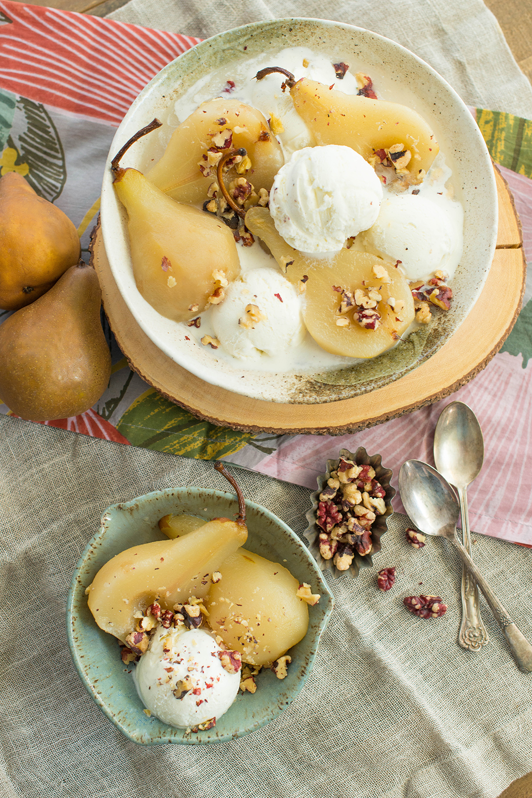 Our summer isn’t quite gone yet. We still have some days with 90 degree weather predicted this week. So to transition into the fall vibe I decided to develop a recipe of poached pears, served with a side of ice cream of course. A little bit of fall with a side of summer.